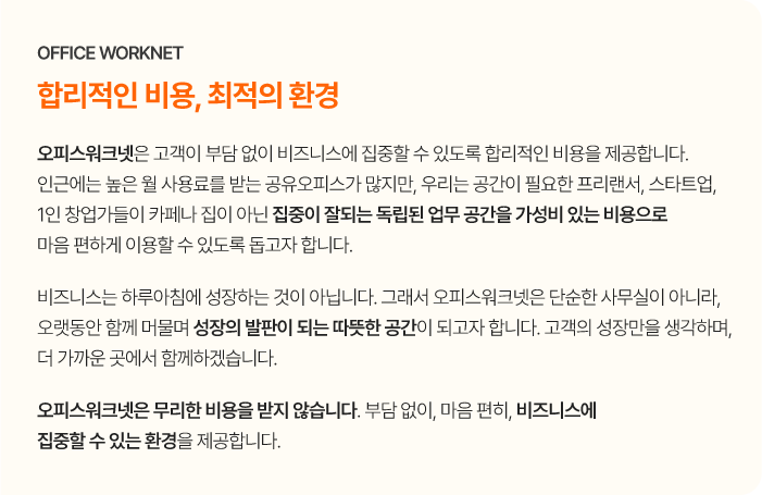 오피스워크넷은 고객이 부담 없이 비즈니스에 집중할 수 있도록 합리적인 비용을 제공합니다. 인근에는 높은 월 사용료를 받는 공유오피스가 많지만, 우리는 공간이 필요한 프리랜서, 스타트업, 1인 창업가들이 카페나 집이 아닌 집중이 잘되는 독립된 업무 공간을 가성비 있는 비용으로 마음 편하게 이용할 수 있도록 돕고자 합니다.