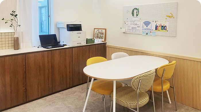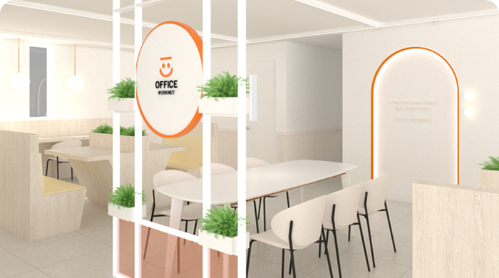 또한, 오렌지 컬러의 상큼한 분위기처럼 기분 전환과 여유를 즐길 수 있도록 커피 한 잔을 마시며 쉴 수 있는 개방적인 홀 공간을 마련했습니다. 넓은 테이블과 개인 지정석도 준비되어 있어, 언제나 편안하게 업무에 집중할 수 있습니다. 이처럼 작은 배려에서 시작된 고객 중심의 공간 기획을 통해 높은 고객 만족도를 실현하며, 이것이 자연스럽게 오피스워크넷의 성장으로 이어지고 있습니다. 더 가까이, 더 편리하게, 더 효율적으로!