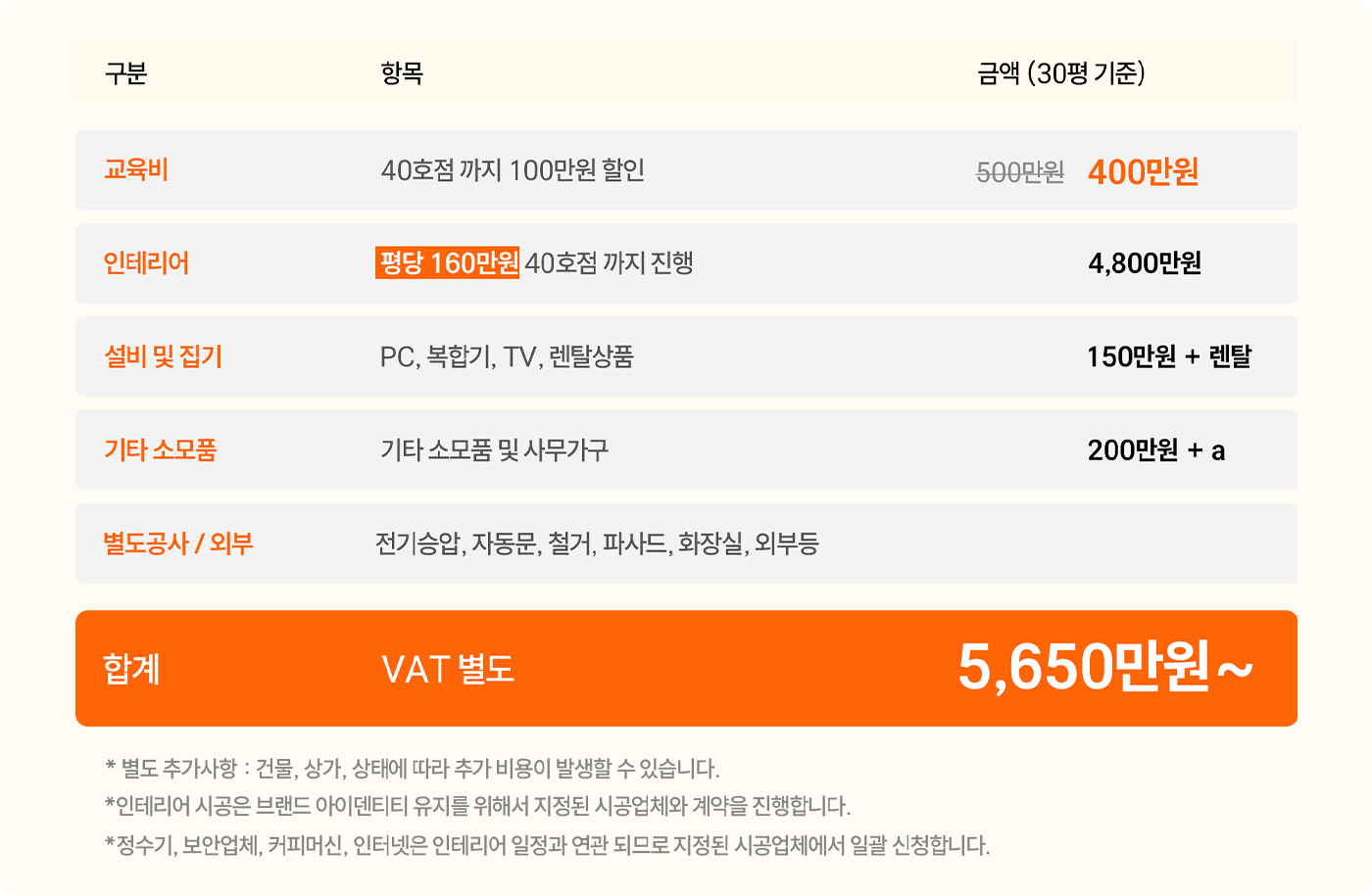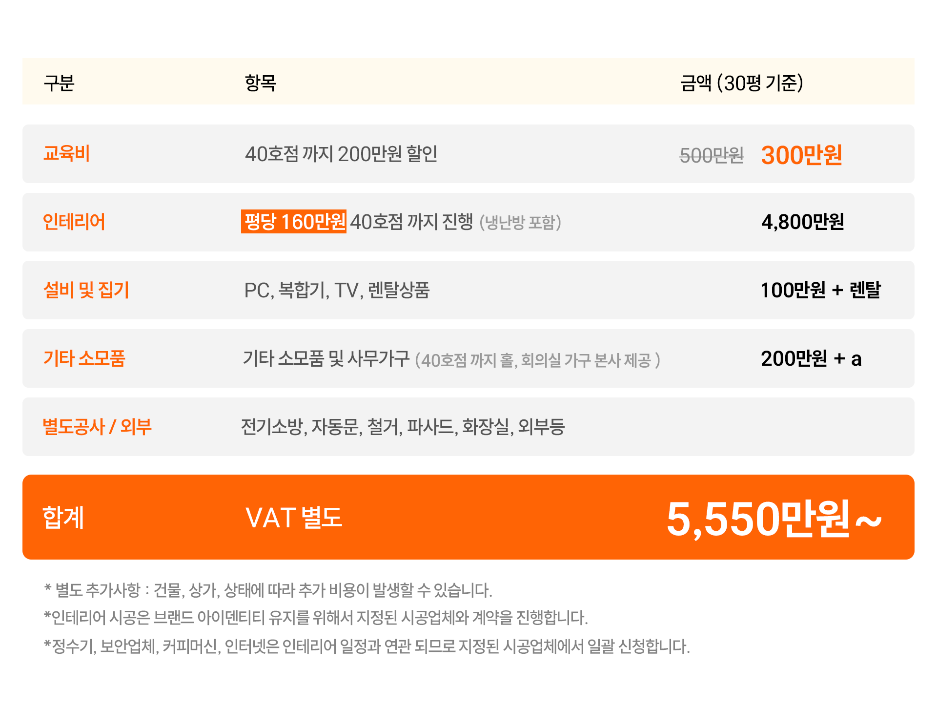 가맹점 50호점까지! 특별 할인 + 무려 12가지의 혜택 제공! 이미 업계 최저가인 인테리어 비용에 혜택까지!